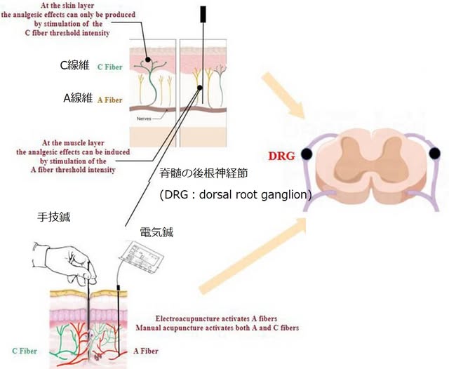 「これらの知見は、低強度の『電気鍼(EA)』の部分的な鎮痛効果は Aβ 線維上の ASIC 3 受容体によって媒介され、高強度の『電気鍼(EA)』の全身鎮痛効果は TRPV1 受容体上の Aδ 線維と C 線維によって媒介される可能性があることを示唆しています」